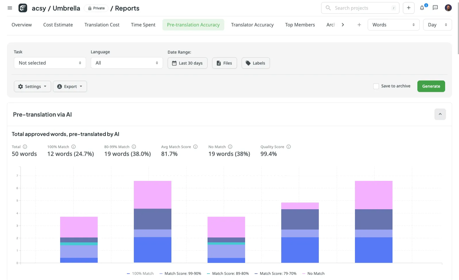 Stop guessing your localization timeline and budget. Get real-time visibility into translation progress, costs, and quality with Crowdin's advanced analytics suite.