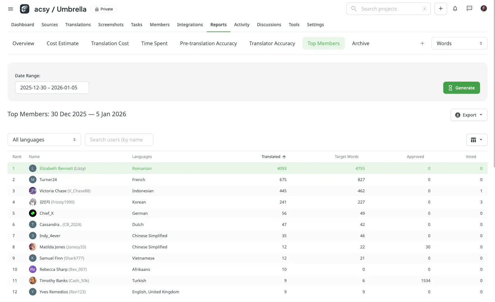 Identify most productive translators and proofreaders with approval ratios.